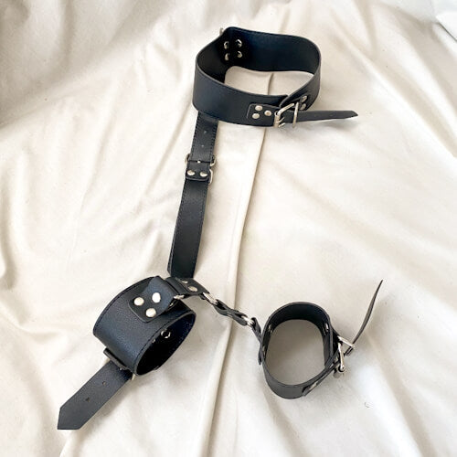 These behind-the-back bondage cuffs are a great way of adding a layer of restraint to your bedroom power play. Strap your partner's neck into the collar and their wrists into the cuffs for some fun BDSM exploration. Made from PU leather, the restraints are durable and comfortable enough for long-term use. They are easy to use and come with metal buckles for security and full adjustment.